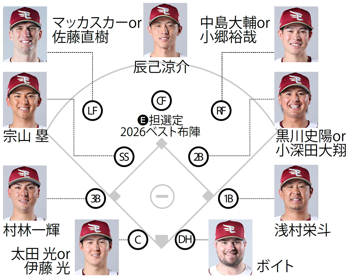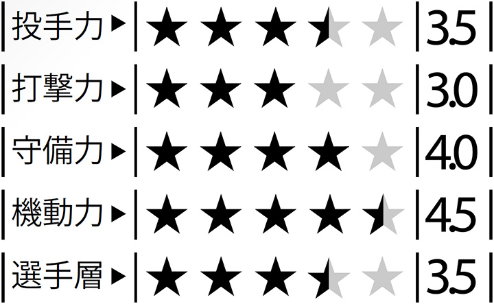 攻撃陣は浅村、ボイト、新助っ人のマッカスカーが得点のキーマンとなり、その周りを打つ選手には出塁率アップが求められる。ボイトの前にランナーをため、足を生かしていかに進塁するかが得点力アップのカギとなるだろう。