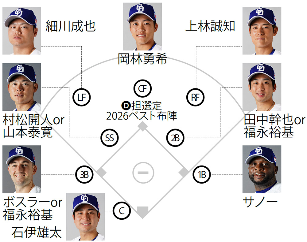 投手陣はシーズンを通して高橋宏、金丸の2人が中心の先発ローテになり、大野雄らベテラン勢が脇を固める。ルーキーの中西、櫻井も有力候補だが、櫻井はアブレウとともにリリーフに回る可能性も。清水、齋藤が出遅れている状況だが、守護神の松山が開幕に間に合いそうなのは朗報だ。
