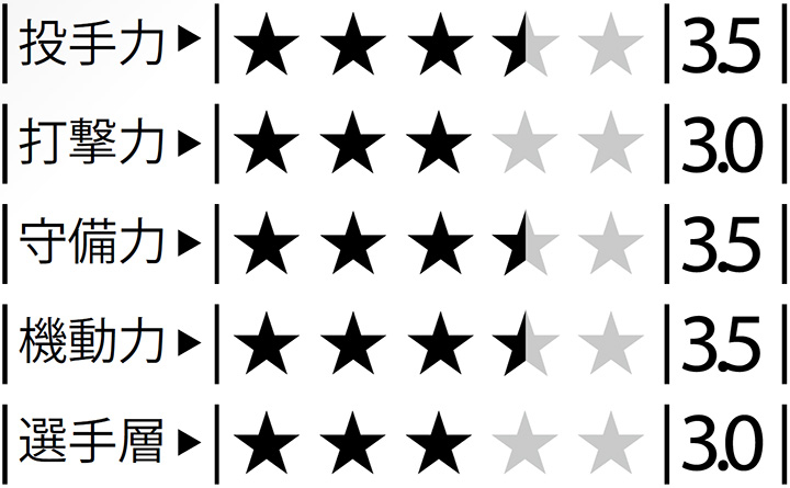 昨年の新人王・西川は右前腕屈筋損傷で調整が遅れ、3月中旬に実戦復帰し、開幕までの完全復調を目指している。ソト、ポランコ、佐藤が今年は機能しそうで、藤原、高部が昨年並みかそれ以上の成績を残せば、上位打線は何とかなる。