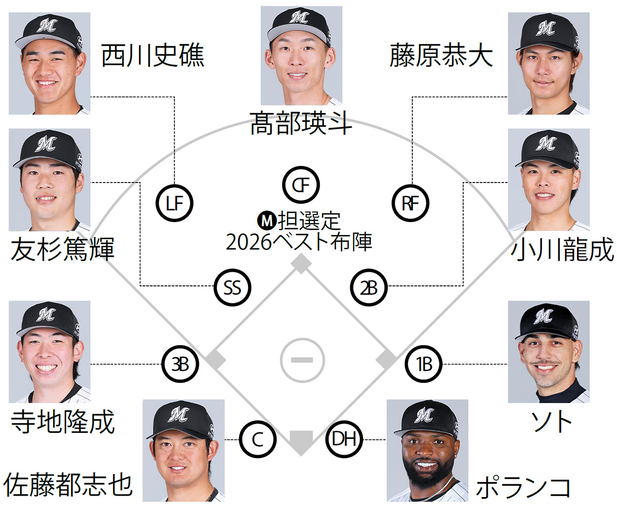 2026年の開幕投手は毛利海大。ドラフト2位のルーキー左腕が大役を任されることとなった。最速150キロ前後の直球とキレのあるスライダーを武器に、試合をつくれる即戦力として期待がかかる。WBCでリリーフの立場だった種市がチームに復帰しても、本来の先発に戻るには調整をし直す必要があり、すぐには難しいだろう。DeNAで昨年10勝したジャクソンは右手人差し指を負傷しており、開幕は難しい。ルーキー・毛利、石垣元気を含め、若い選手の躍動がチーム強化に不可欠だ。彼らの成長が、チームの成績のプラス分となる。